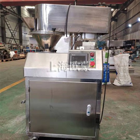 本機(jī)有送料機(jī)構(gòu)、壓片機(jī)構(gòu)、液壓機(jī)構(gòu)、機(jī)架和電氣控制等部件組成,送料,壓片、制粒均采用變頻無(wú)級(jí)調(diào)速,油泵壓力可調(diào),成品細(xì)度可以通過(guò)更換不同的篩網(wǎng)獲得。改進(jìn)制粒轉(zhuǎn)籠,增加了顆粒的成品率。本機(jī)裝拆、清洗方便,與物料接觸部分皆為不銹鋼制作。產(chǎn)品符合GMP要求。物料由頂部送料漏斗加入,經(jīng)兩壓輪強(qiáng)制擠壓成片狀后進(jìn)入下部制粒室,在制粒室中片狀物料被制粒刀片打碎,然后進(jìn)入整粒室,直至顆粒小于或等于網(wǎng)孔徑,顆粒通過(guò)網(wǎng)篩到盛料托盤。所需要顆粒大小可以通過(guò)調(diào)整篩網(wǎng)大小來(lái)決定。
